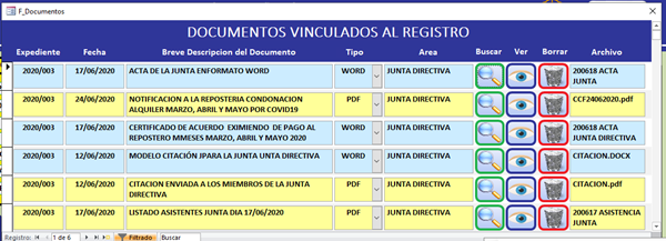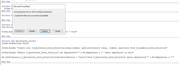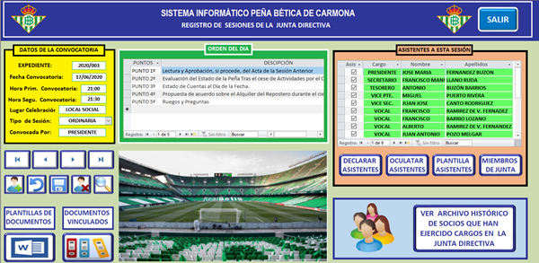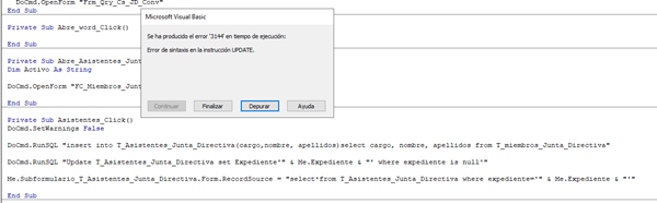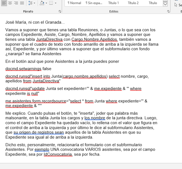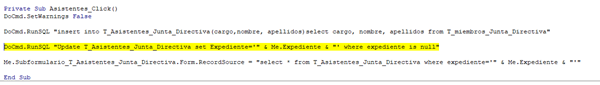 Tengo un formulario "F_Junta_Directiva" que depende de la tabla "T_Junta_Directiva" La idea es que en este formulario se vayan registrando las reuniones que celebre la Junta Directiva. En el formulario, además de los campos que lo identifican. (Expte., Fecha Hora, Lugar de celebración, convocante, etc), he puesto un Subformulario para declarar los Puntos del Orden del Día que se debatirán en esa Sesión. - Y otro Subformulario Asistentes a esta Sesión.