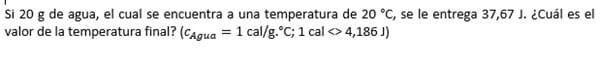 Si 20 g de agua, el cual se encuentra a una temperatura de 20 °C, se le entrega 37,67 J. ¿Cuál es el valor de la temperatura fi
