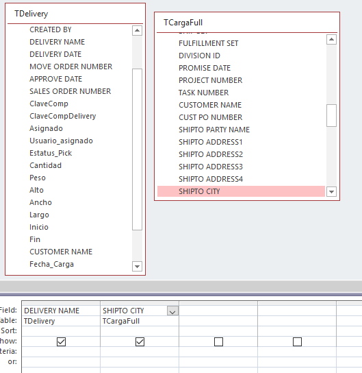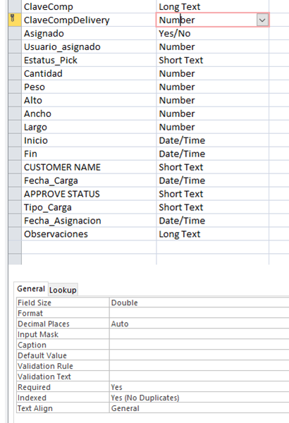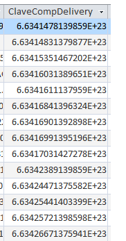 CurrentDb.Execute ("UPDATE TCarga1 SET ClaveCompDelivery=[DELIVERY NAME]&[MOVE ORDER NUMBER]&[SALES ORDER NUMBER]")Despues en mi tabla definitiva (en la cual muevo los registros de la temporal) pongo mi columna ClaveCompDelivery como Numero Double