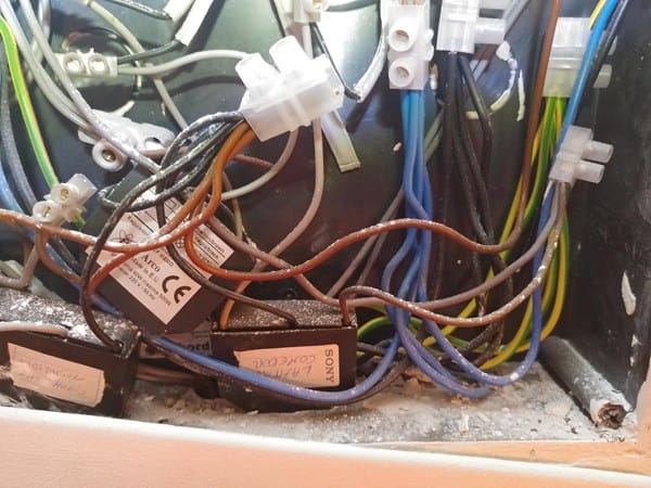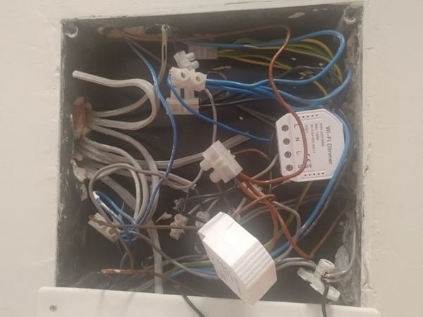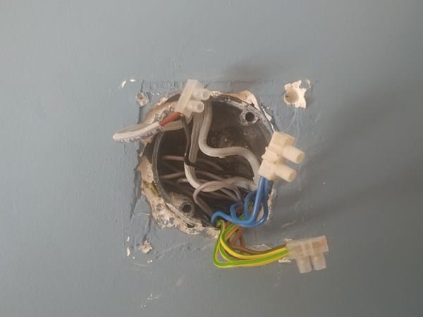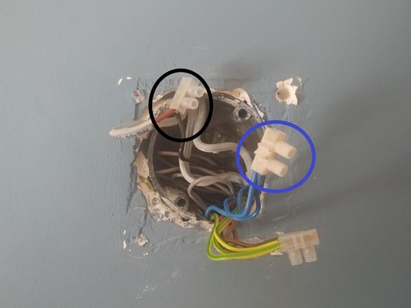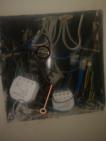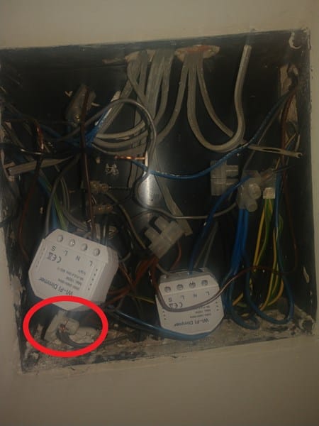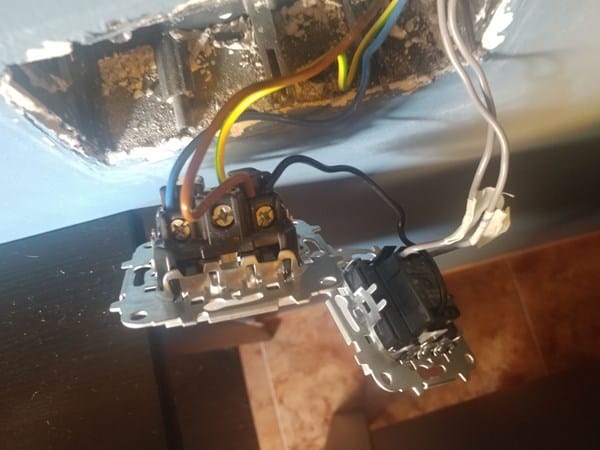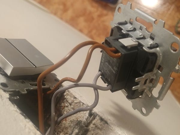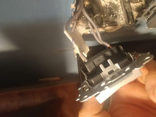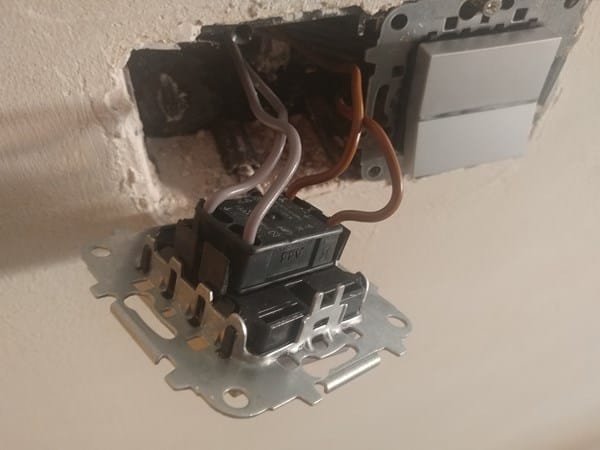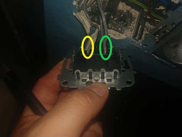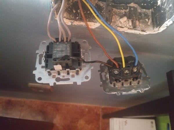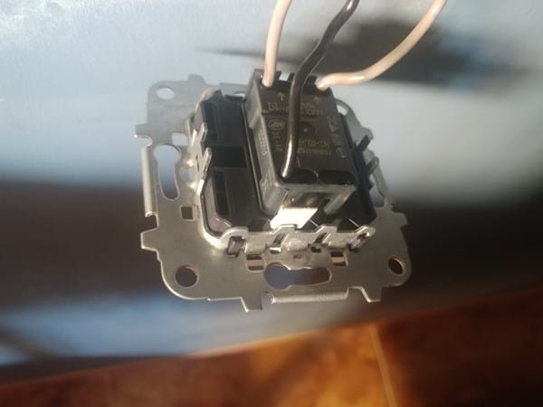 Este es el conmutador de al lado de la cámara donde digo que llegan 4 cables grises que venían unidos en 1, lo he puesto así pero seguro que esta mal aunque incluso sin ponerlo la luz sigue siempre encendida: