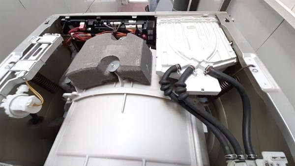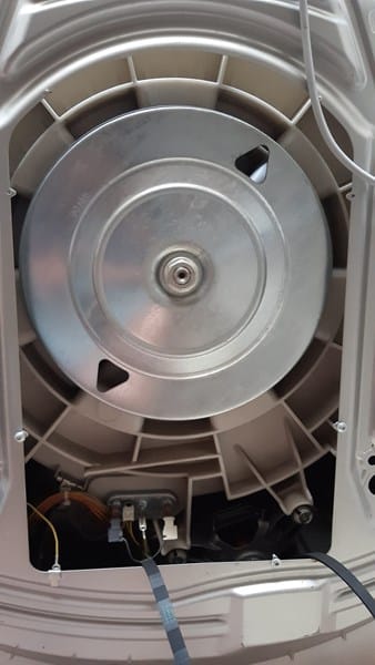 La lavadora no hace ningún ruido de claqueteo al girar el bombo, ni se ve óxido por atrás, por lo que diría que los cojinetes están en buen estado (aunque no lo he desmontado para comprobarlo). También he revisado que las fijaciones del peso que hay encima del bombo esta bien apretadas.