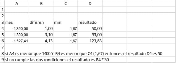 Si alguien puede ayudarme a como puedo calcular en Excel teniendo en cuenta si A4 es menor que 1400 Y B4 es menor que C4 (1,67) entonces el resultado D4 es 50si no cumple las dos condiciones el resultado es B4 * 30
