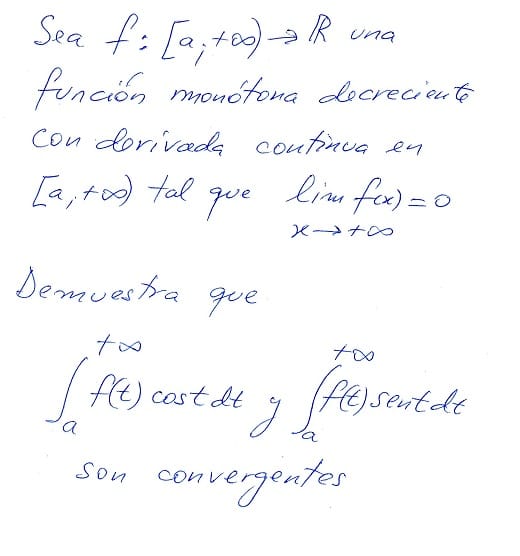 $$\begin{align}&\int_{a}^{+\infty}f(t)\cos t ~dt=\int _{a}^{+\infty}f(t) ~d\sin t=\left.[f(t)\sin t]\right|_{a}^{+\infty}-\int_{a}^{+\infty}f'(t)\sin t~dt ~~~~~~~~~~~~~~~~~~~~~~\\&\\&\int_{a}^{+\infty}f(t)\cos t ~dt= \lim\limits_{t\to +\infty}f(t)\sin t-f(a)\sin a-\int_{a}^{+\infty}f'(t)\sin t~dt\\&\\&\int_{a}^{+\infty}f(t)\cos t ~dt= -f(a)\sin a-\int_{a}^{+\infty}f'(t)\sin t~dt\\&\\&\color{green}{\text{Ahora veamos la integral }\int_{a}^{+\infty}f'(t)\sin t~dt}\\&\\&\left|\int_{a}^{+\infty}f'(t)\sin t~dt\right|\leq \int_{a}^{+\infty}|f'(t)|~dt\\&\\&\color{green}{\text{Como la función f es monotonamente decreciente entonces }f'[0,+\infty]<0}\\&\\&\left|\int_{a}^{+\infty}f'(t)\sin t~dt\right|\leq -\int_{a}^{+\infty}f'(t)~dt\\&\\&\left|\int_{a}^{+\infty}f'(t)\sin t~dt\right|\leq f(a) -\lim\limits_{t\to+\infty}f(t)\\&\\&\left|\int_{a}^{+\infty}f'(t)\sin t~dt\right|\leq f(a)\\&\\&\color{Blue}{\text{Retornemos a }\int_{a}^{+\infty}f(t)\cos t ~dt= -f(a)\sin a-\int_{a}^{+\infty}f'(t)\sin t~dt}\\&\\&\left|\int_{a}^{+\infty}f(t)\cos t ~dt\right|= \left|-f(a)\sin a-\int_{a}^{+\infty}f'(t)\sin t~dt\right|\\&\\&\left|\int_{a}^{+\infty}f(t)\cos t ~dt\right|= \left|f(a)\sin a+\int_{a}^{+\infty}f'(t)\sin t~dt\right|\\&\\&\left|\int_{a}^{+\infty}f(t)\cos t ~dt\right|\leq |f(a)\sin a|+\left|\int_{a}^{+\infty}f'(t)\sin t~dt\right|\\&\\&\left|\int_{a}^{+\infty}f(t)\cos t ~dt\right|\leq 2 f(a)\\&\\&\textbf{L.Q.Q.D}\end{align}$$