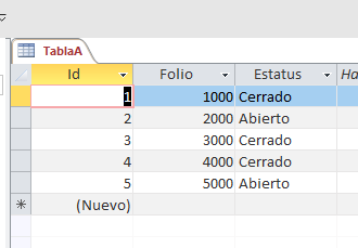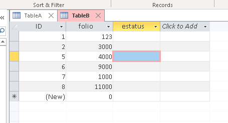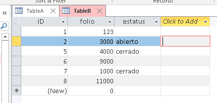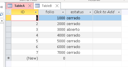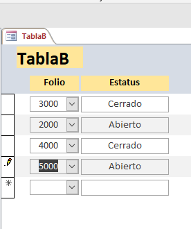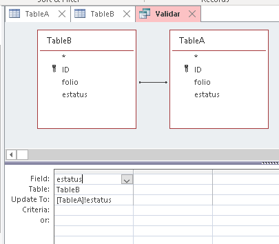 De su apoyo. Tengo la Tabla A con el campo [Folio] y [Estatus], tengo la Tabla B con el campo [Folio] y [Estatus].