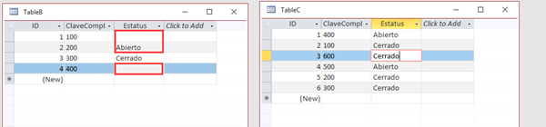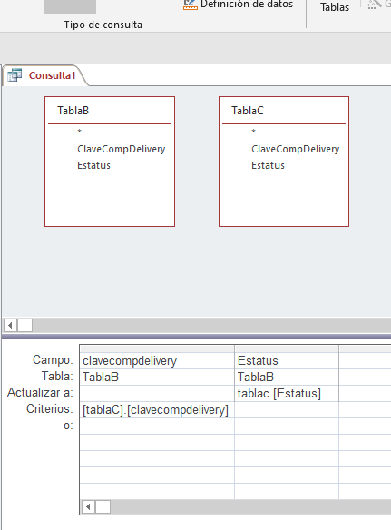 Actualiza [TablaB]![Estatus] con [TablaC]![Estatus] cuando [TablaB]![Estatus] sea diferente a [TablaC]![Estatus] y el campo [TablaB]![ClaveCompDelivery] = [TablaC]1[ClaveCompDelivery]