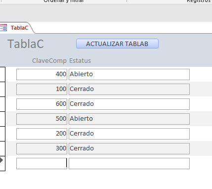 Private Sub Comando0_Click() DoCmd.SetWarnings False DoCmd.runbsql "UPDATE TablaB, TablaC SET TablaB.Estatus = [tablac].[estatus] WHERE TablaB.ClaveComp=tablac.clavecomp" End Sub