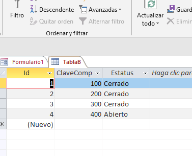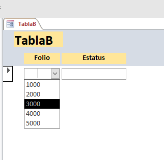 Donde le he dejado un par de ellos abiertos para que veas como van cogiendo valor. Y tengo el formulario basado en la tabla B, donde he sustituido el cuadro de texto Folio en un combinado en cuyo origen de la fila le he puesto