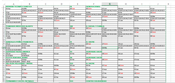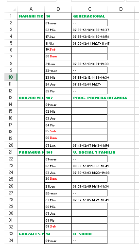 - Cada nombre debería tener grupos de filas en pares, es decir, una fila con días y la fila de abajo con horarios.