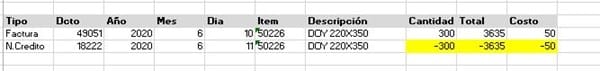 Mi problema está en que no tienen una relación correlativa, solo veo que el "enganche" se puede realizar a través del 'item', año, y mes, donde la condición del mes sería N.Credito>=Factura, puesto que la N.Credito se realiza después de la factura.