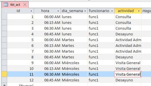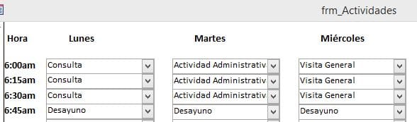 Estoy creando un access en el cual debo registrar las actividades de mis compañeros de forma semanal y por rangos de tiempo de 15 minutos.