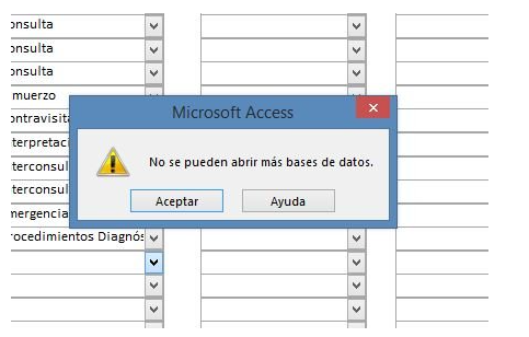 Caso 2: vuelvo abrir el formulario, empiezo de forma manual a seleccionar una a una cada actividad, pero al seleccionar la actividad 130 me empieza a dar el error "no se pueden abrir más bases de datos" y el cuadro combinado no despliega mas la lista de actividades.