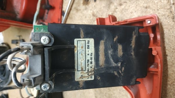 Tengo un problema con una hilti, modelo tp400, es un martillo eléctrico. Después de cambiarle las escobilla, ajustarle los conectores, etc, me encuentro con el problema de que empieza a funcionar y se para. Conecte la maquina directamente a corriente saltándome el mango y va como una bala, demasiado rápido el motor, por lo menos eso creo no recuerdo a que revoluciones iba. Pues en el mango me encuentro una pieza que pinenso que es la culpable, no se que es, la he fotografiado para ver si podéis decirme que puede ser y su función.