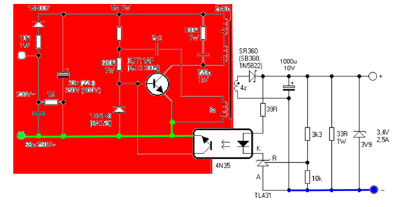 Desde la toma de corriente de la red eléctrica hasta el primario del transformador chopper tenemos la zona caliente la cual si la tocamos aunque sea en su masa o tierra nos dará una descarga unipolar a tierra.