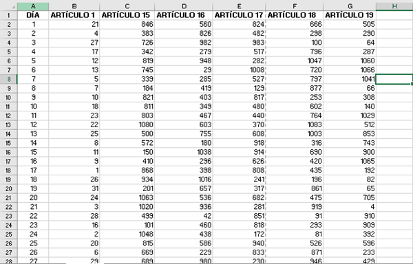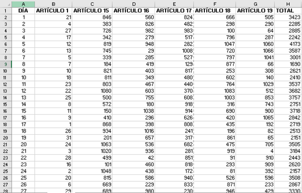 -En las columnas de la “B” en adelante vienen el número de unidades vendidas de cada artículo (cada columna corresponde a un artículo).