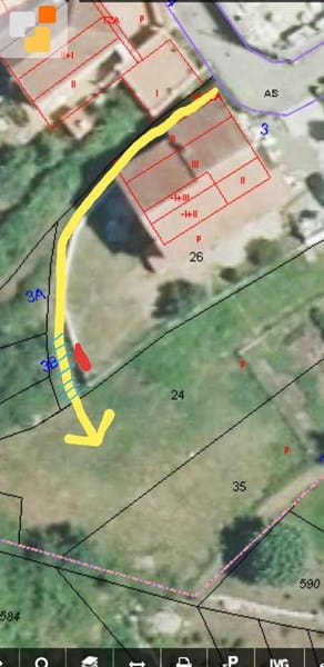 Estoy casi totalmente convencido de que todo el camino de servicio me pertenece, de hecho, según la foto adjunta sacada del catastro, el camino de servidumbre se encuentra dentro de la delimitación de la finca 26 que es la mía, pero el dueño de las dos fincas "3b" dice que esa franja de camino (rallado en azul) le pertenece a él.