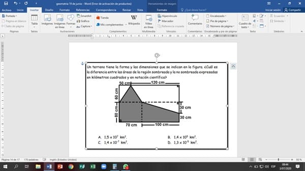 Un terreno tiene forma y las dimensiones que se indican en la figura. ¿Cuál es la diferencia entre las áreas de la región sombreada y la no sombreada expresadas en kilómetros cuadrados y en notación científica?