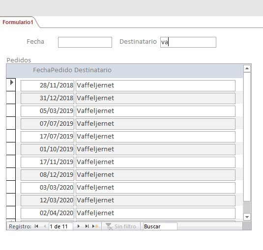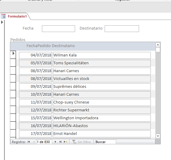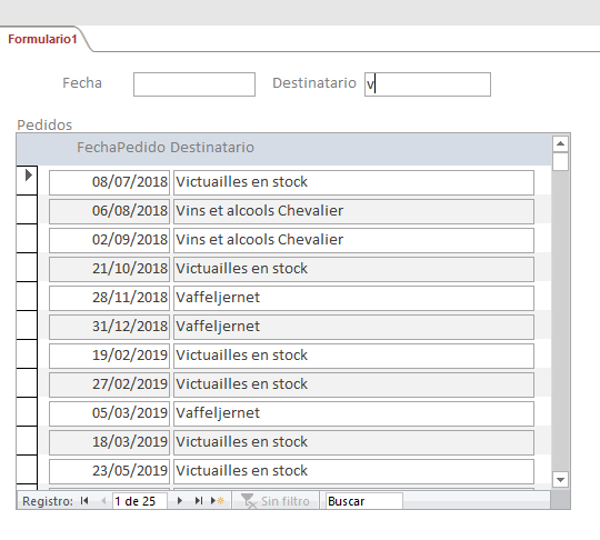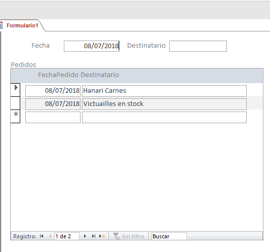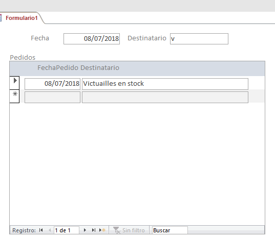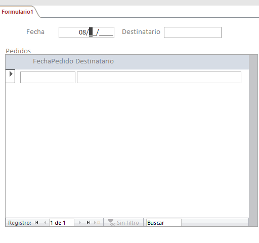 Me.Pedidos.Form.RecordSource = "select fechapedido,destinatario from pedidos where fechapedido =Forms!formulario1!Fecha and destinatario" _