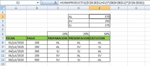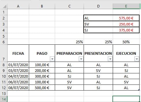 Recurro a la ayuda de los expertos ya que no logro estructurar esto con una fórmula, necesito sumar a cada tienda el porcentaje que debe cobrar de un pago realizado de acuerdo a quien haya llevado a cabo 3 criterios establecidos: quien lo prepara (25%), quien lo presenta (25%) y quien lo ejecuta (50%), Adjunto tabla para que podáis ver a lo que me refiero con el resultado que debería dar en cada una. Espero vuestra amable ayuda :)
