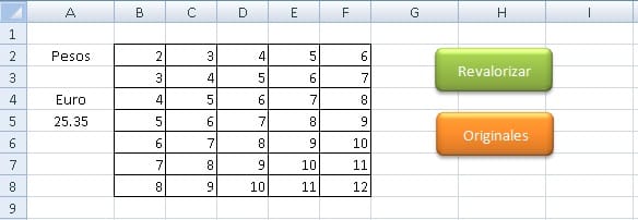 La macro copia los valores originales a la hoja2. Convierte los valores a Euros. Cambia la celda A2 a "Euros".