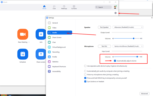 Me ocurre que no se queda aplicado el volumen en los niveles del micrófono. Pongo el nivel que muestro en imagen, pero cuando entro en ZOOM para videoconferencia, se baja el volumen. Lo mismo ocurre si apago el portátil y al día siguiente lo vuelvo a poner en marcha, baja otra vez. Lo único que se mantiene fijo es la amplificación de micrófono.