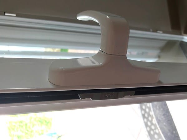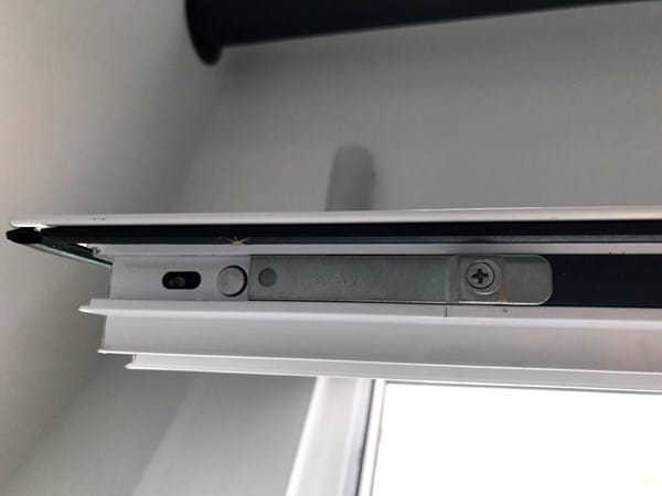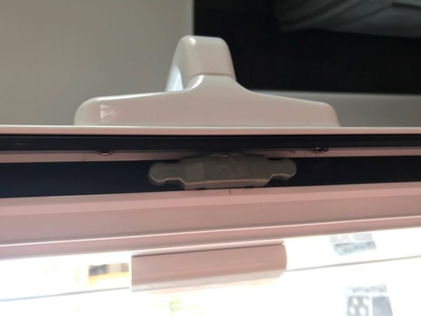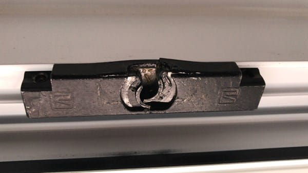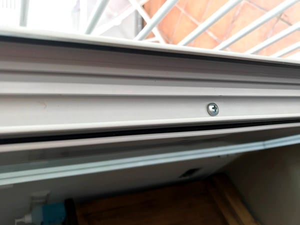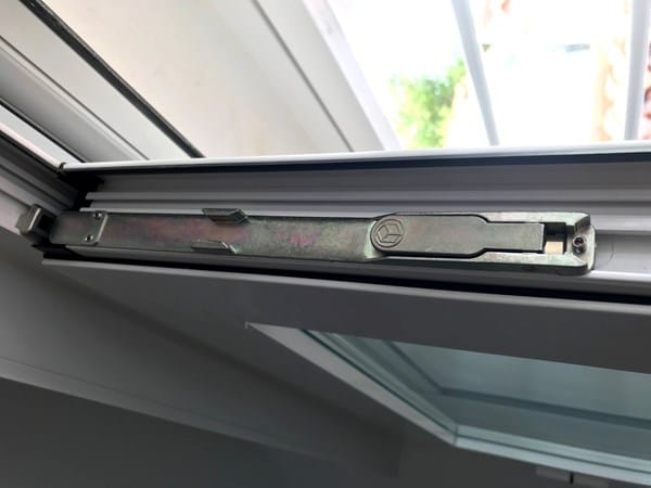 Como me quejé, me dijeron que la manivela no se podía cambiar y me instalaron una pieza en el marco superior que básicamente sujetaba una especie de bulón que pusieron en la hoja. Esa pieza terminó por romperse en un mes y además, no me gusta porque tenemos que forzar la puerta para que se trabe y no se mueva y volver a forzar para que la libere (no sé el nombre exacto pero adjunto foto de la pieza rota que he quitado).