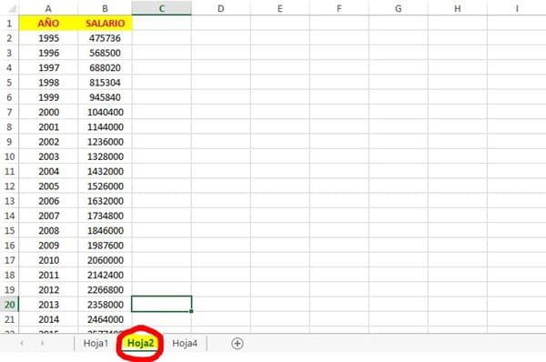 TABLA DE SALARIOS POR AÑO; AÑO 2000= 500, AÑO 2001 = 700, AÑO 2002 = 900, AÑO 2003 = 930, AÑO 2004 = 950. etc
