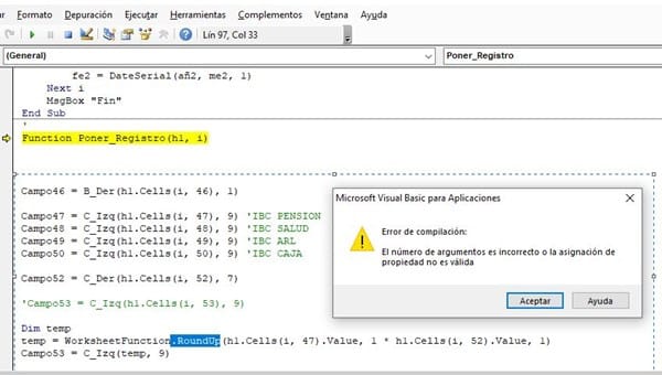 Campo50 = C_Izq(h1.Cells(i, 50), 9) 'IBC CAJA campo51 = String(9, "0") nAño = Right(Range("O2").Value, 4) Set f = Sheets("Hoja2").Range("A:A").Find(nAño, , xlValues, xlWhole) If Not f Is Nothing Then If Val(campo47) >= f.Offset(, 1).Value Then campo51 = Format(Val(campo47) * 0.5, "000000000") End If Campo52 = C_Der(h1.Cells(i, 52), 7) 'Tarifa AFP