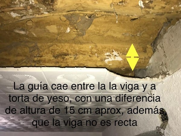 4-No se como puedo poner la guía superior a la altura y nivel adecuado, fijada en un techo de forjado con vigas de madera retorcidas, y torta de yeso pegada en cañizo entre las mismas, ya que la guía justo pasa a trozos por la viga de madera y a trozos por la torta de yeso que está a una altura diferente. Por que imagino que en un falso techo de escayola es inviable montar un tabique así.