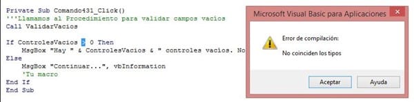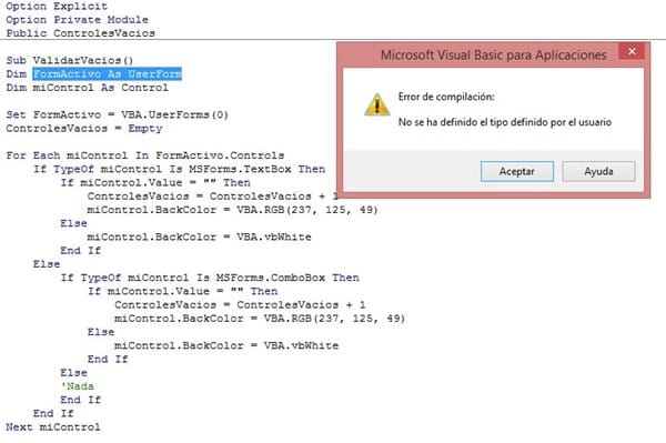 Me encontré un código para que me marque cuales controles se encuentran vacíos, pero al momento de ejecutar el botón se muestra el siguiente mensaje: