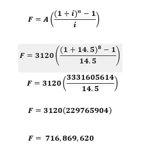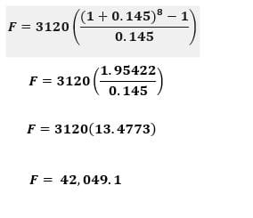 Si un analista de sistemas ahorra cada año $3,120MXN en una página crowdfunding que da un 14.5% de interés capitalizado anualmente, ¿cuánto tendrá al finalizar el octavo año?