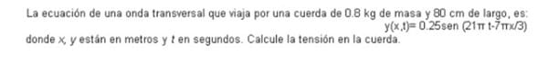La ecuación de una Onda transversal que viaja por una cuerda de 0.8kg de masa y 80 cm de largo es