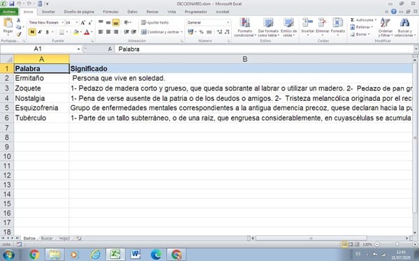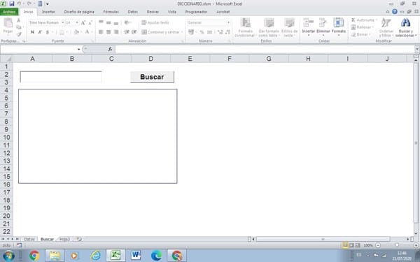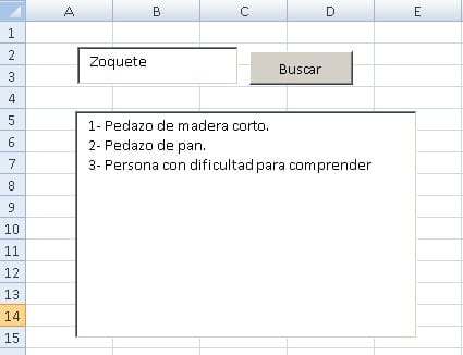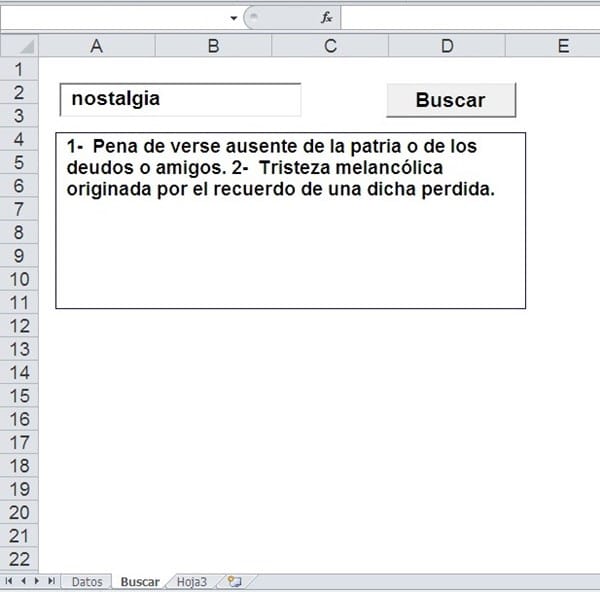 Intento hacer algo similar a un diccionario y en la columna "A" de la hoja1 (Datos) tengo unas palabras, y en la columna "B" el significado. En la hoja2 (Buscar) tengo dos cajas de texto (TextBox1 y TextBox2) y un botón. Cuando introduzco una palabra en el textbox1 y hago click en el botón, me busca el significado y me lo carga en el textbox2.