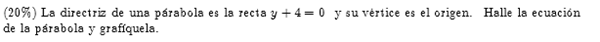 MatemáticasProfesoresCiencias e IngenieríaFísicaCálculo Andrea perez el 21 jul. 20 La directriz de una parabola es la recta y + 4 = 0 y su vertice es el origen. Seguir Siguiendo Dejar de seguir 1 respuesta Respuesta de albert buscapolos Ing° 1 1 albert buscapolos Ing°, Me retiro gradualmente del Foro. Gracias a todos !! . ALBERT ING. Ecuacion general de la forma:y(x) = ax^2 + bx + cGuiate por las expresiones;a= 1/2p......................b= - xv / p .....................c= xv^2/2p + yv ......razonas la ecuacion y tenes todo hecho.La grafica seria: el 22 jul. 20 - Anónimo ahora mismo Añadir comentario Usa los comentarios si quieres aportar algo a esta respuesta. No los utilices para preguntar algo nuevo. Cancelar Enviar