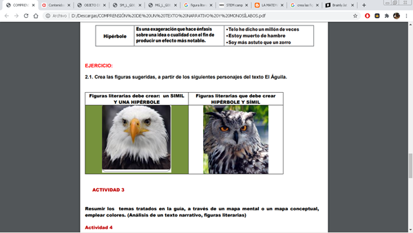 Un águila, cierto día, mirando hacia abajo desde su altísimo nido, vio un búho. -¡Qué gracioso animal! – Dijo para sí-. Ciertamente no debe ser un pájaro. Picada por la curiosidad, abrió sus grandes alas, y descubriendo un amplio círculo comenzó a descender. Cuando estuvo cerca del búho, le preguntó: -¿Quién eres? ¿Cómo te llamas? -Soy el búho – contestó temblando el pobre pájaro. Tratando de esconderse detrás de una rama. - ¡Ja!, ¡Ja! ¡Qué ridículo eres! – Rió el águila, dando vueltas alrededor del árbol-. Eres todo ojos y plumas. Vamos a ver –siguió el águila, posándose sobre la rama-, veamos de Etapa Flujo de aprendizaje Enseñanza/Actividades de aprendizaje Recursos recomendados cerca cómo estás hecho. Déjame oír mejor tu voz. Si es tan bella como tu cara, habrá que taparse los oídos. 2. El águila mientras tanto, ayudándose con las alas, trataba de abrirse camino entre las ramas para acercarse al búho. Pero entre las ramas del árbol un campesino había dispuesto unas varas enlazadas y esparcido abundante liga en las ramas más gruesas. El águila se encontró de improviso con las alas pegadas al árbol y cuanto más forcejeaba por librarse, más se le pegaban todas sus plumas. El búho dijo: 3. -Águila, dentro de poco vendrá el campesino, te agarrará, y te encerrará en una jaula. O puede que te mate para vengar los corderos que tú has comido. Tú que vives siempre en el cielo, libre de peligros. ¿Qué necesidad tenías de bajar tanto para reírte de mí?