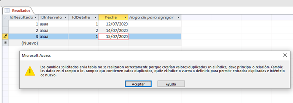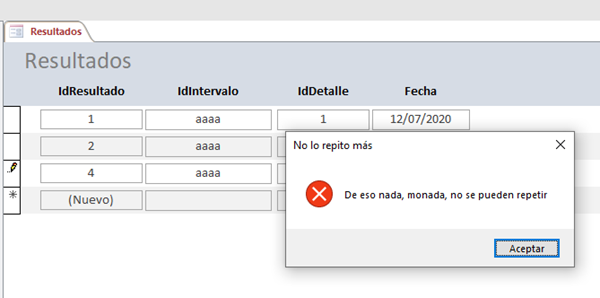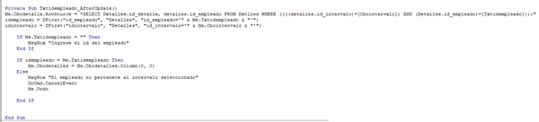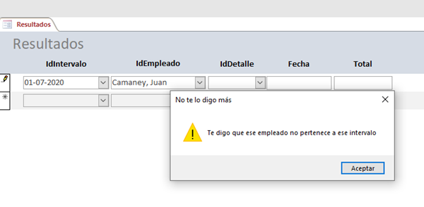 Mi problema es que tengo un formulario con origen de control la tabla resultados y necesito que luego de seleccionar el id_intervalo y al ingresar el id_empleado verifique si el empleado pertenece a ese intervalo, si no es así me muestre un mensaje que diga que ese empleado no coincide con el intervalo seleccionado, si coinciden me permita guardarlo.