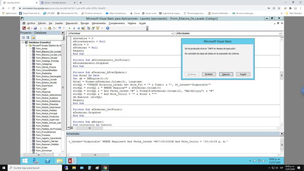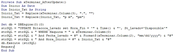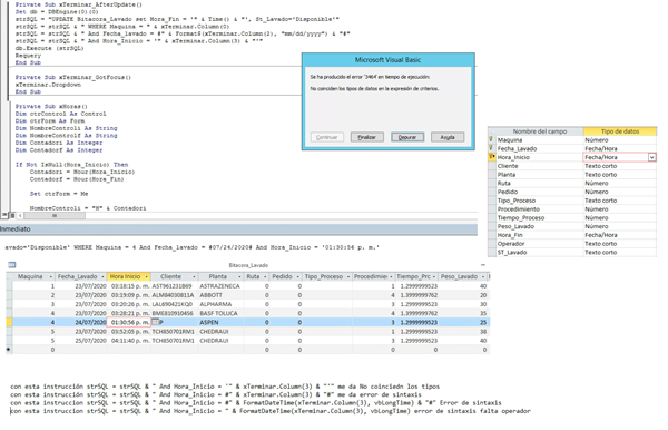 ... AND HoraInicio=#" & FormatDateTime(xTerminar.Column(3),vbLongTime) & "#" -> el mismo comentario que arriba