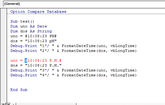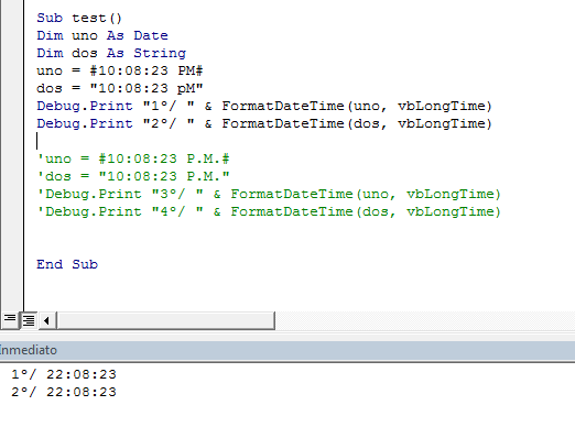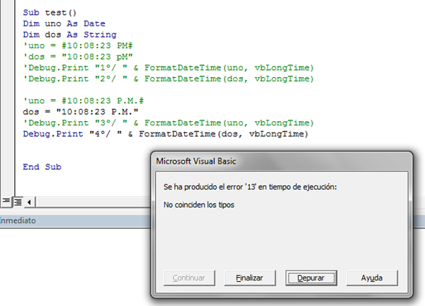 Si tengo una variable de fecha (uno) y le asigno el segundo valor (con el P.M.) el propio editor de VBA me dice que no es una fecha válida (lo marca en rojo y salta error de sintaxis si intento ejecutar el código. Si le doy un valor como el primero (con PM) lo acepta como fecha. Si la variable está definida como texto (variable dos), admite las dos sin problema.