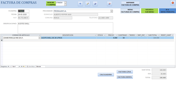 Que tiene algunos datos de la factura de compra. También tengo un formulario con subformulario para ingresar la compras