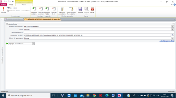 Entonces en el formulario AERTICULOS agregue otro botón para que me busque ese informe con el detalle de la compra de dicho articulo seleccionado en el cuadro combinado, pero no logro encontrar el código apropiado para que me traiga ese informe. ¿Estará bien lo que estoy haciendo o estoy tomando un camino equivocado?