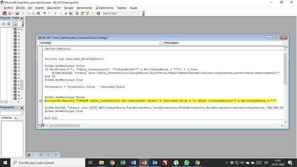 Private Sub Cantidad_AfterUpdate() DoCmd.SetWarnings False If Nz(DCount("*", "Tabla_Inventario2", "CodigoBarra='" & Me.CodigoBarra & "'")) = 0 Then DoCmd. RunSQL "insert into Tabla_Inventario2(CodigoBarra, ValorVenta, DepartamentoInsumo)values(codigobarra, precioventa, Departamento)" End If DoCmd.SetWarnings True Inventario = Inventario.Value - Cantidad.Value DoCmd.SetWarnings False CurrentDb.Execute "UPDATE Tabla_Inventario2 set cantidad2= dsum(" & Cantidad.Value & ") where [CodigoBarra]='" & Me.CodigoBarra & "'" DoCmd. RunSQL "insert into HIST_MOV(CodigoBarra, TipoMovimiento, CantMovimiento, FechaMovimiento, HoraMovimiento)values(codigobarra,'SALIDA-INSUMOS', cantidad, date(), time())" DoCmd.SetWarnings True End Sub