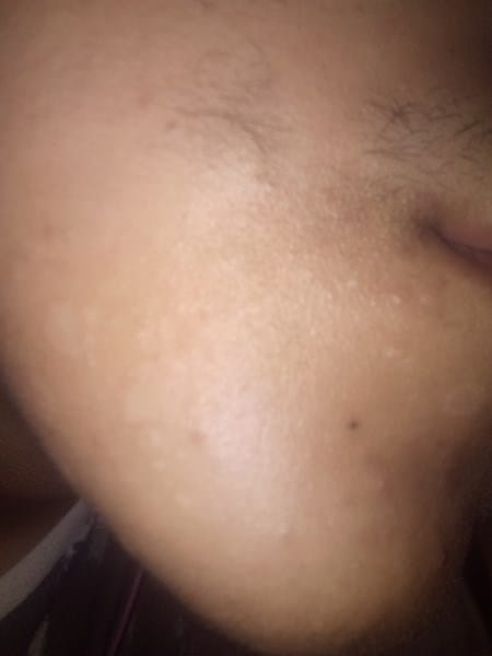 Lo que pasa es que aproximadamente hace 3 semanas en la cara específicamente en el cuello me empezó a brotar una especie de granitos y ronchas que en mi país se les llama así (parecidas a las picaduras por mosquitos), en esa parte poco a poco se fue extendiendo a mi mandíbula así como a mi perfil derecho en el rostro, mi novia que fue la que me informó de esto me había dicho que eso no era normal, paso 1 semana y esta especie de erupción o no se como puedo llamarle empezó a brotar en mis brazos izquierdo y derecho así como en la parte alta de la espalda, algo a destacar es que no me causan absolutamente nada de comezón y parecen ser picaduras de moscos pero sin comezón en lo absoluto solo están allí además de unos pequeños granos que al quererlos quitar o rascar sin motivo se desgarran y queda un punto rojo como sangre o como un barro pero son muy pequeños y no causan ni dolor ni nada por el estilo, les adjunto una imagen la verdad no se que puede ser