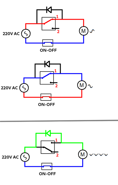En la intentar 1 yo veo que el diodo esta en paralelo con el motor... pero no entiendo que pasa en la intentar 2... no entiendo que sentido tiene... si la corriente va al motor y luego va al diodo y del diodo a la fuente...¿Para qué esta la intentar 2? No le encuentro sentido!