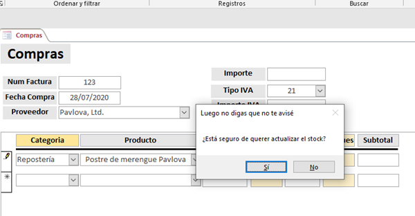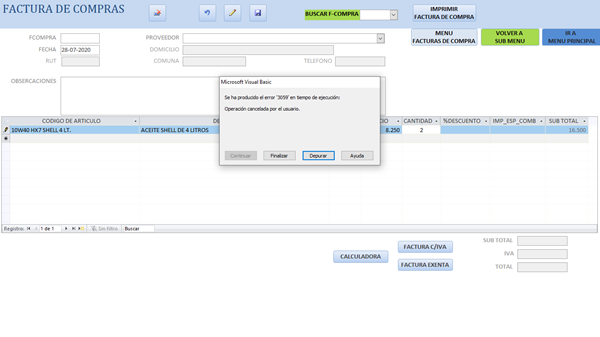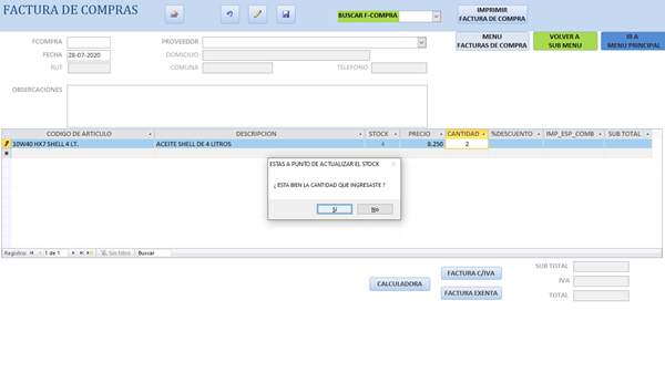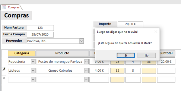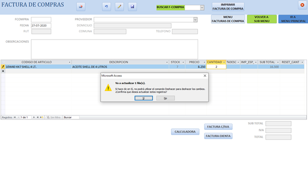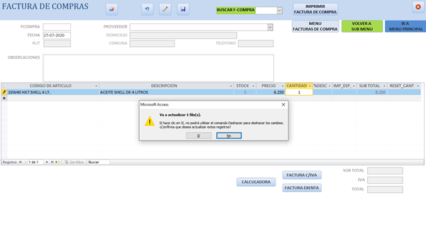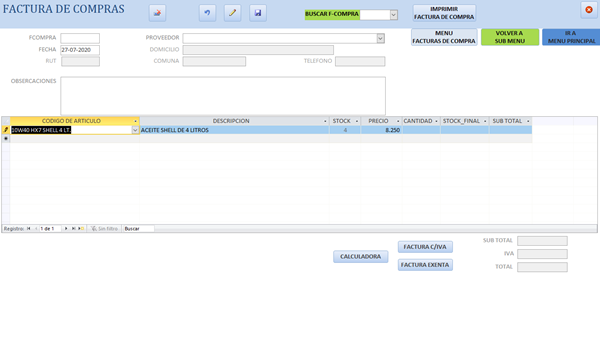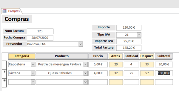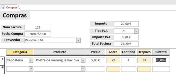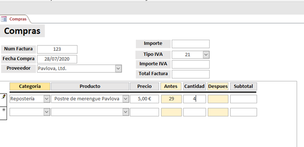 Quería pedirles de su ayuda con un formulario que tengo llamado "factura de compra" con un subformulario "detalle de factura". En este subformulario tengo los campos CÓDIGO DE ARTICULO, DESCRIPCIÓN, STOCK, PRECIO, CANTIDAD_FC, STOCK_FINAL, SUBTOTAL.