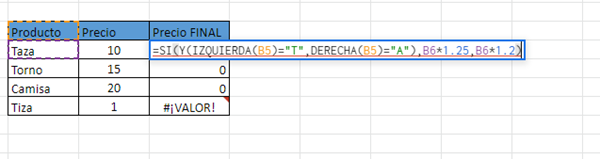 Tengo que crear una fórmula de modo que se aplique un incremento del 25% a todos aquellos productos que empiecen por la letra T y terminen por la letra A. El resto tendrán un descuento del 20%.