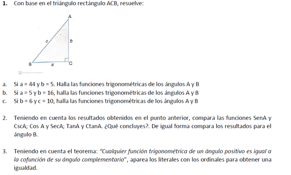 Cualquier función trigonométrica de un ángulo positivo agudo, es igual a la cofunción de su ángulo complementario.