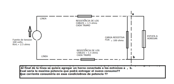 Sabiendo que el trorema de máxima transferencia determina que la resistencia de la carga debe ser igual a la resistencia interna de la fuente más los cables, 5,5 ohm, calculas la resistencia del horno, que esta en paralelo con 100 ohm. La del horno debe ser 5,82 ohm. El teorema determina que la tensión se divide por igual entre la resistencia de la fuente y cables y la carga, llegando a la carga solo 50v. Calculas con esto la corriente en el horno y su potencia. Según los decimales que pongas te da 429,55 o 430w. - vicente14