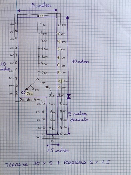 Tengo que hacer las pendientes a mi terraza de 10 x 5 metros junto a una pasarela de 5 x 1,5 metros, tengo 1 desagüe en la esquina, ¿he hecho un croquis decidme si voy bien encaminada o explicarme como debo hacerlo?