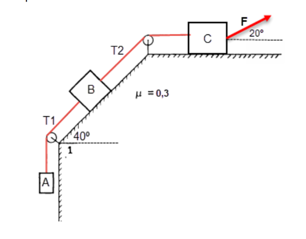 Se tiene un sistema como muestra la figura, donde mA=8(Kg), mB= 4(Kg)y mC=6(Kg), en las superficies existe un coeficiente de rozamiento cinético de 0,3. Determinar: