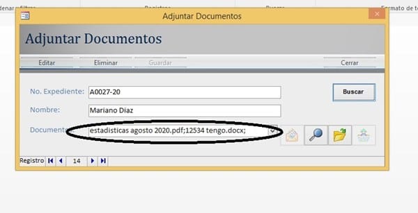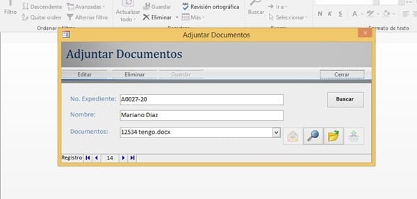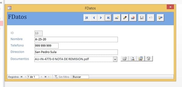 Me.ID & ". " & Me. Direccion2º/ En tu formulario para cargar los documentos, espero que los botones para navegar por los registros sean unos botones personalizados (y que tengan los mismos códigos que los del ejemplo original) y no los que traen los formularios de Access por defecto como "botones de navegación", porque si no es así, mal asunto...