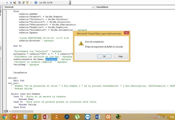 MsgBox "Se ha producido el error " & Err.Number & " en el proceso GuardaDatosRecordset: " & Err.Description, vbInformation + vbOKOnly, "ERROR"